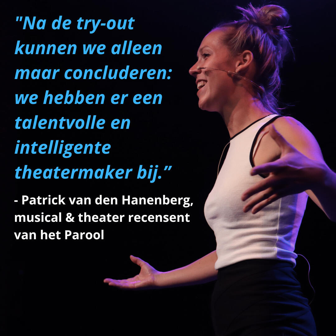 In 2022 nam ik afscheid van mijn carrière bij het Ministerie van Buitenlandse Zaken, om helemaal voor deze droom te gaan.Maar waar begin je, als je niet bent opgeleid in het theatervak? Met als motto 'dichtbij jezelf beginnen en dan groter uitbouwen' maakte ik als eerste deze one-woman-musical.
